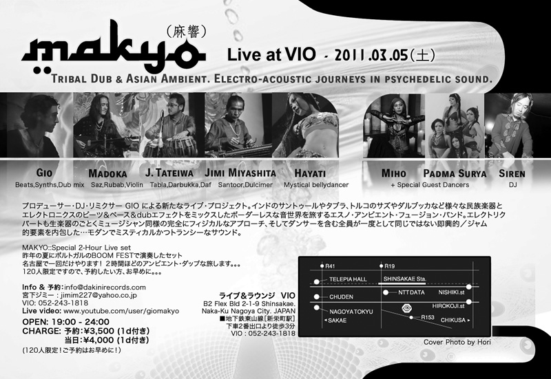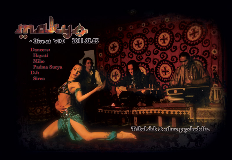 インド&中近東の弦楽器&パーカション+エレクトロニックなビーツ&ベースを混ぜるエスノ・アンビエント・フュージョン音楽を探検するバンドMAKYO +神秘的ベリーダンサー Hayati、MIHO, & Padma Surya.